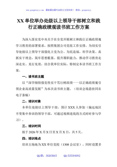 / XX单位举办处级以上领导干部树立和践行正确政绩观读书班工作方案