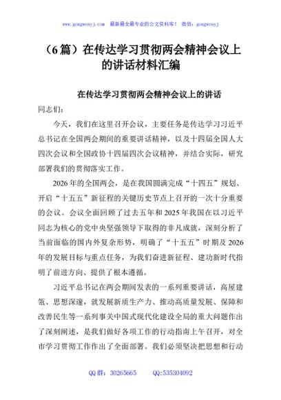 (6篇)在传达学习贯彻两会精神会议上的讲话材料汇编