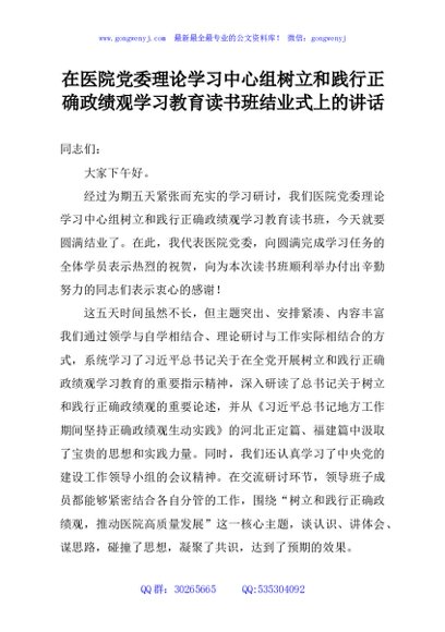 在医院党委理论学习中心组树立和践行正确政绩观学习教育读书班结业式上的讲话 - 公文研究