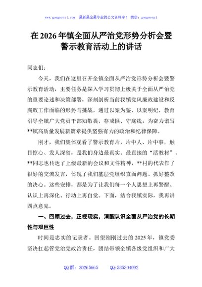 / 在2026年镇全面从严治党形势分析会暨警示教育活动上的讲话
