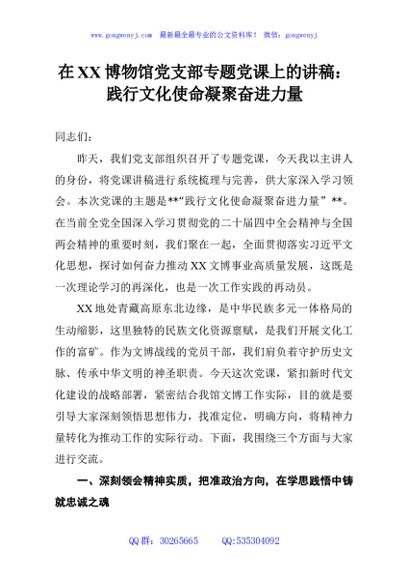 / 在XX博物馆党支部专题党课上的讲稿:践行文化使命凝聚奋进力量