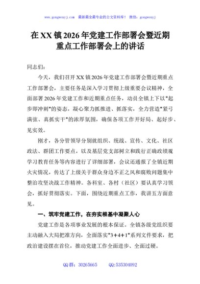 未生成预览图,长按二维码添加 在XX镇2026年党建工作部署会暨近期重点工作部署会上的讲话 - 公文研究