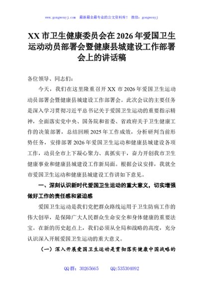 / XX市卫生健康委员会在2026年爱国卫生运动动员部署会暨健康县城建设工作部署会上的讲话稿