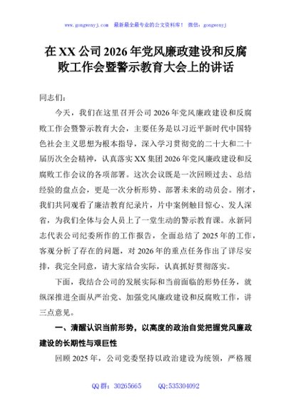 / 在XX公司2026年党风廉政建设和反腐败工作会暨警示教育大会上的讲话