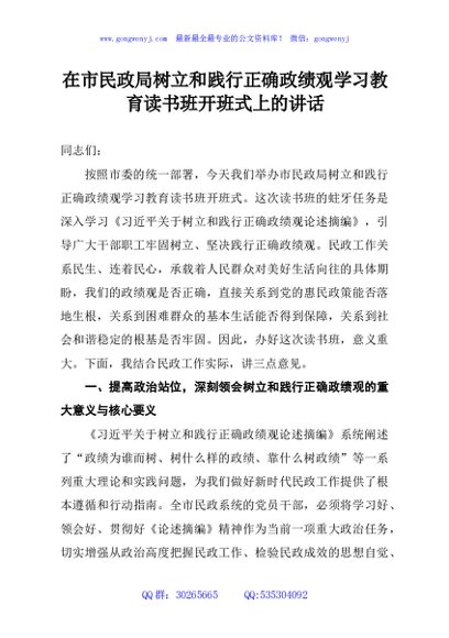 / 在市民政局树立和践行正确政绩观学习教育读书班开班式上的讲话