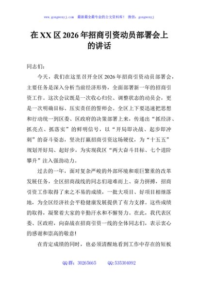 / 在XX区2026年招商引资动员部署会上的讲话