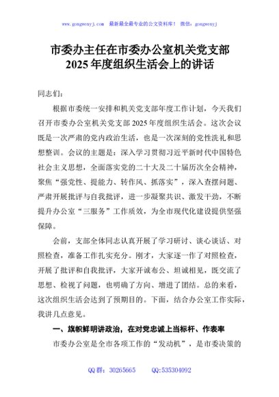 / 市委办主任在市委办公室机关党支部2025年度组织生活会上的讲话