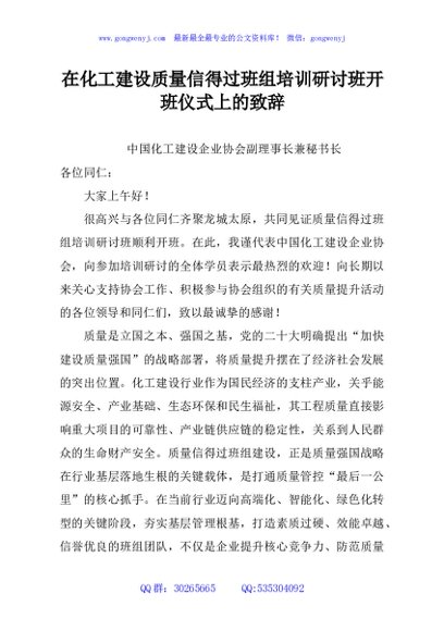 / 在化工建设质量信得过班组培训研讨班开班仪式上的致辞