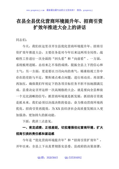 / 在县全县优化营商环境提升年、招商引资扩效年推进大会上的讲话