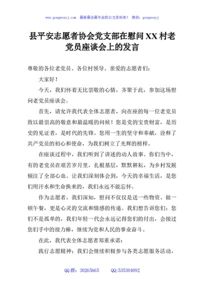 / 县平安志愿者协会党支部在慰问XX村老党员座谈会上的发言