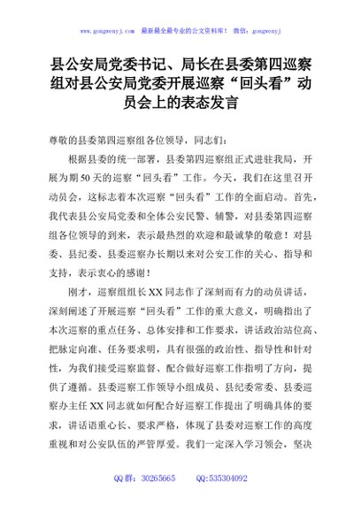 / 县公安局党委书记、局长在县委第四巡察组对县公安局党委开展巡察“回头看”动员会上的表态发言