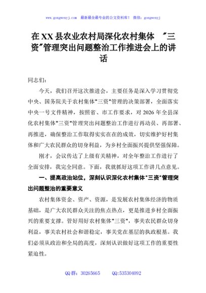 / 在XX县农业农村局深化农村集体三资管理突出问题整治工作推进会上的讲话