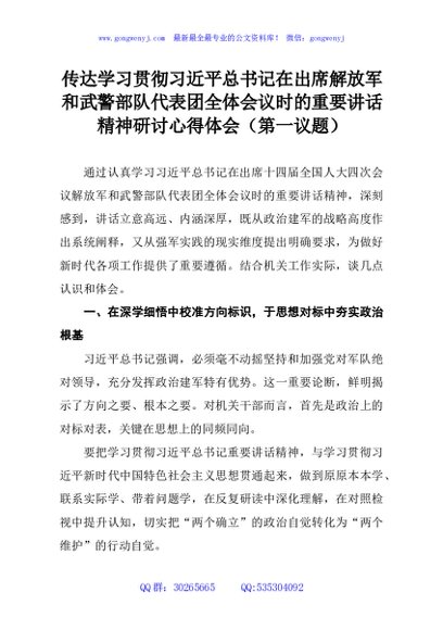 传达学习贯彻习近平总书记在出席解放军和武警部队代表团全体会议时的重要讲话精神研讨心得体会(第一议题) - 公文研究