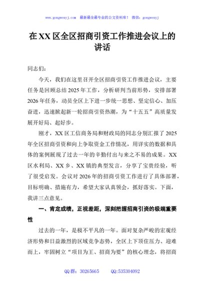 / 在XX区全区招商引资工作推进会议上的讲话