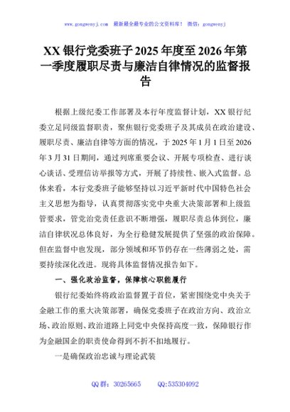 / XX银行党委班子2025年度至2026年第一季度履职尽责与廉洁自律情况的监督报告