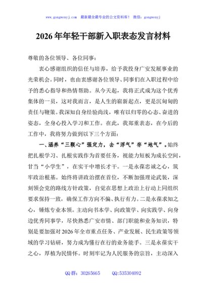 / 2026年年轻干部新入职表态发言材料