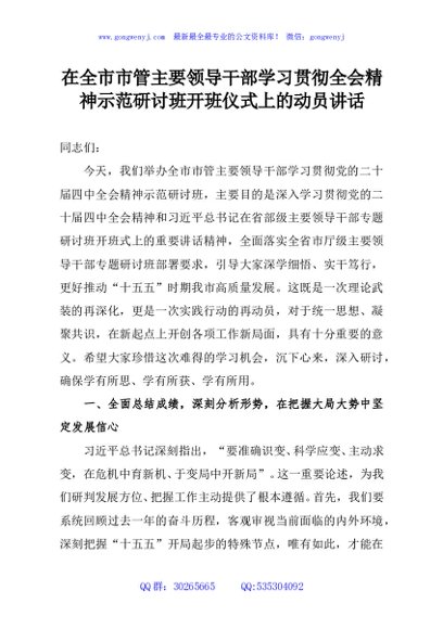 / 在全市市管主要领导干部学习贯彻全会精神示范研讨班开班仪式上的动员讲话