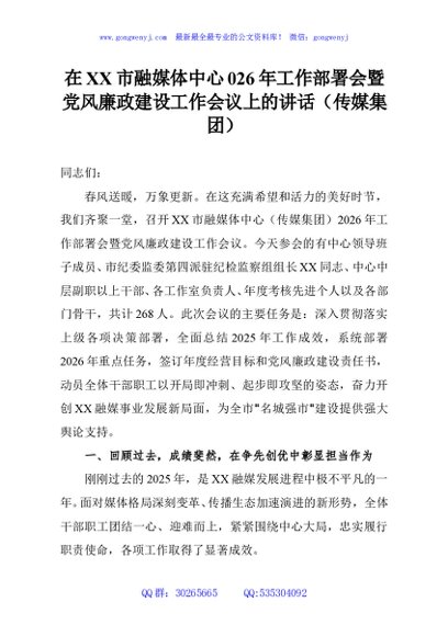 / 在XX市融媒体中心026年工作部署会暨党风廉政建设工作会议上的讲话(传媒集团)