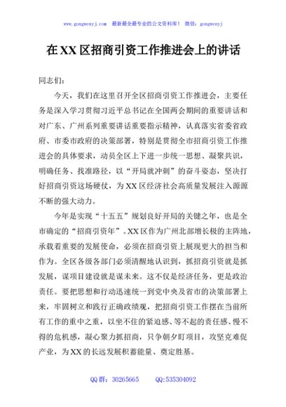 / 在XX区招商引资工作推进会上的讲话