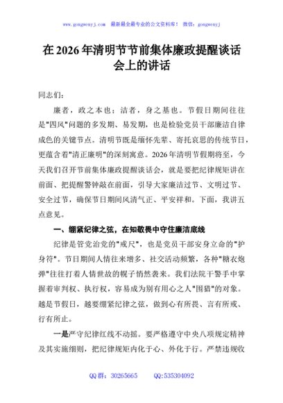 / 在2026年清明节节前集体廉政提醒谈话会上的讲话