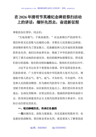 / 在2026年清明节英雄纪念碑前祭扫活动上的讲话:缅怀先烈志,奋进新征程