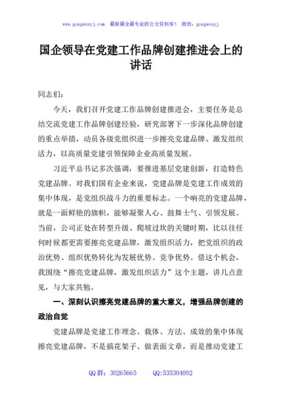 / 国企领导在党建工作品牌创建推进会上的讲话