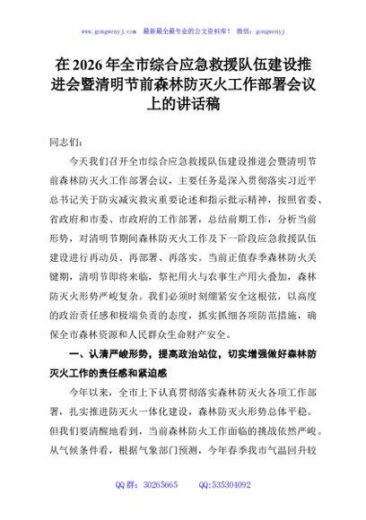 / 在2026年全市综合应急救援队伍建设推进会暨清明节前森林防灭火工作部署会议上的讲话稿