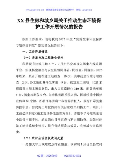 / XX县住房和城乡局关于推动生态环境保护工作开展情况的报告