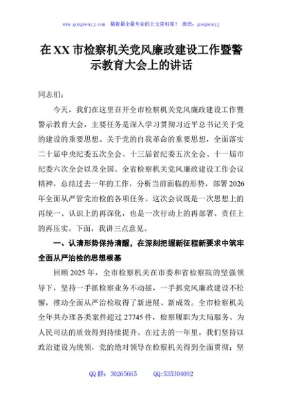 / 在XX市检察机关党风廉政建设工作暨警示教育大会上的讲话