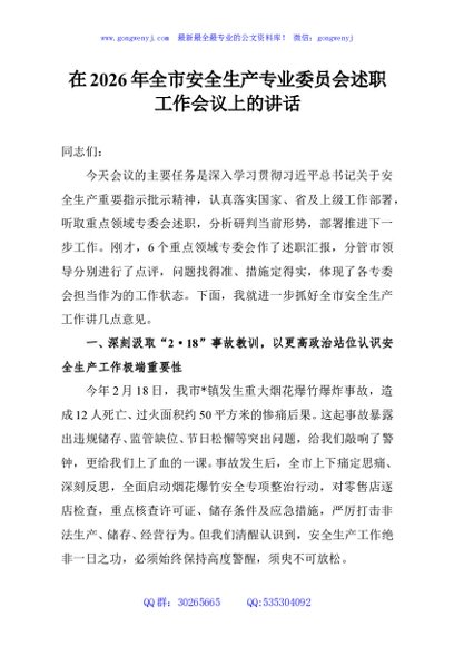 / 在2026年全市安全生产专业委员会述职工作会议上的讲话