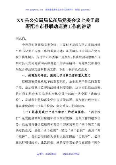 / XX县公安局局长在局党委会议上关于部署配合市县联动巡察工作的讲话
