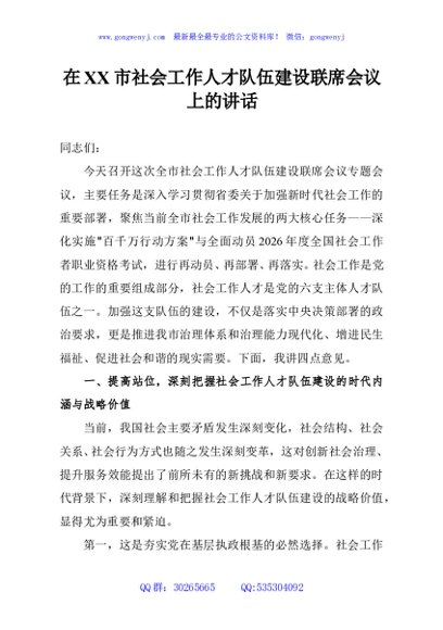 / 在XX市社会工作人才队伍建设联席会议上的讲话
