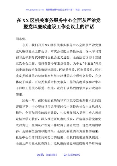/ 在XX区机关事务服务中心全面从严治党暨党风廉政建设工作会议上的讲话