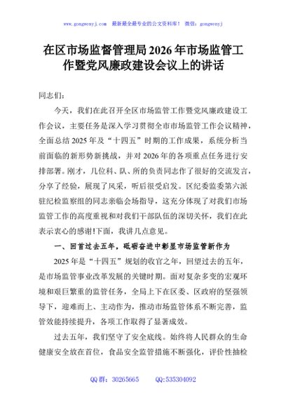 / 在区市场监督管理局2026年市场监管工作暨党风廉政建设会议上的讲话