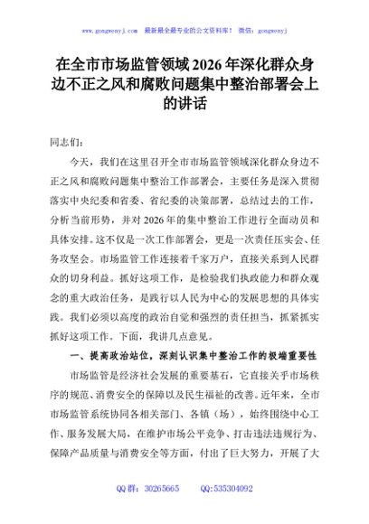 / 在全市市场监管领域2026年深化群众身边不正之风和腐败问题集中整治部署会上的讲话