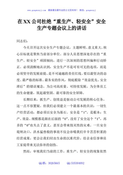 / 在XX公司杜绝“重生产、轻安全”安全生产专题会议上的讲话