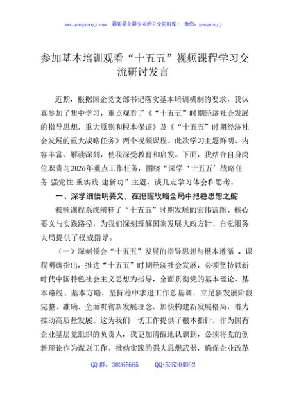 参加基本培训观看“十五五”视频课程学习交流研讨发言
