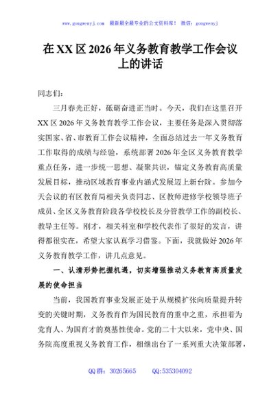 / 在XX区2026年义务教育教学工作会议上的讲话