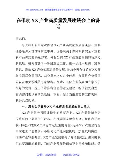 / 在推动XX产业高质量发展座谈会上的讲话