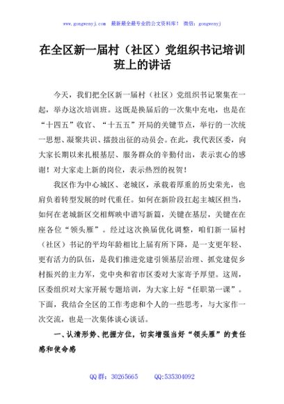 / 在全区新一届村(社区)党组织书记培训班上的讲话
