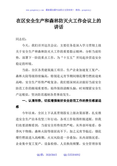 / 在区安全生产和森林防灭火工作会议上的讲话