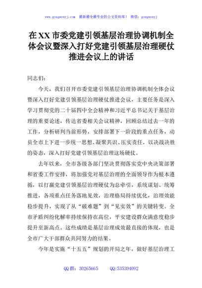 / 在XX市委党建引领基层治理协调机制全体会议暨深入打好党建引领基层治理硬仗推进会议上的讲话