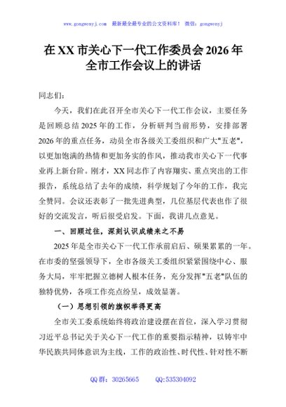 / 在XX市关心下一代工作委员会2026年全市工作会议上的讲话