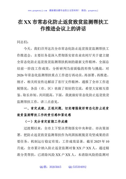 / 在XX市常态化防止返贫致贫监测帮扶工作推进会议上的讲话