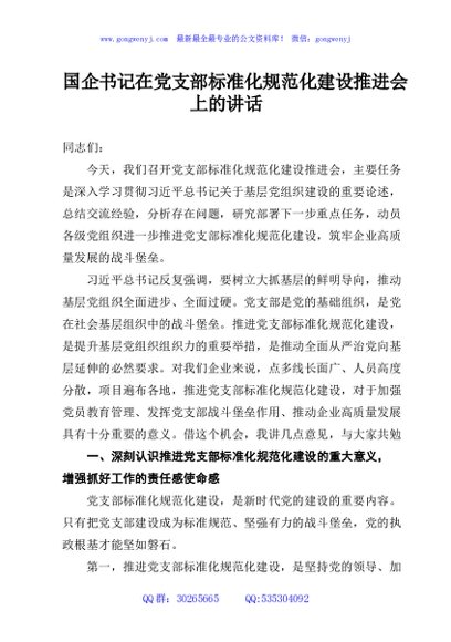 / 国企书记在党支部标准化规范化建设推进会上的讲话