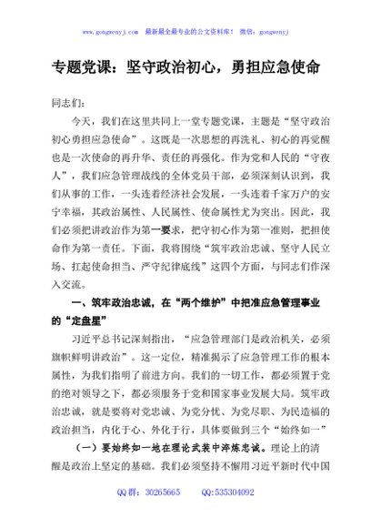 / 专题党课:坚守政治初心,勇担应急使命