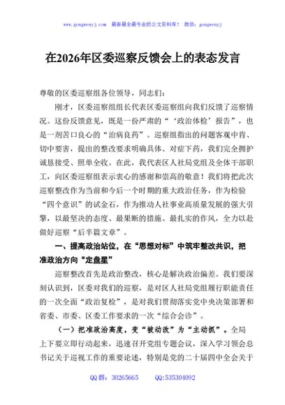 / 在2026年区委巡察反馈会上的表态发言