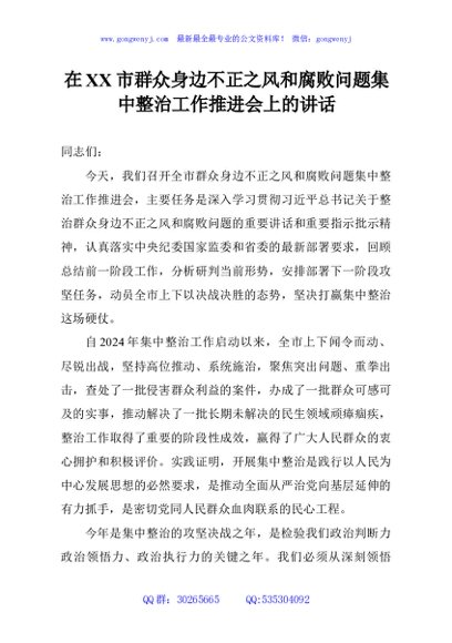 / 在XX市群众身边不正之风和腐败问题集中整治工作推进会上的讲话