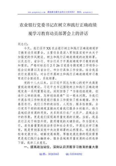 / 农业银行党委书记在树立和践行正确学习教育动员部署会上的讲话