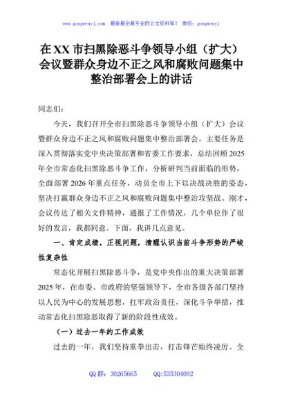 / 在XX市扫黑除恶斗争领导小组(扩大)会议暨群众身边不正之风和腐败问题集中整治部署会上的讲话